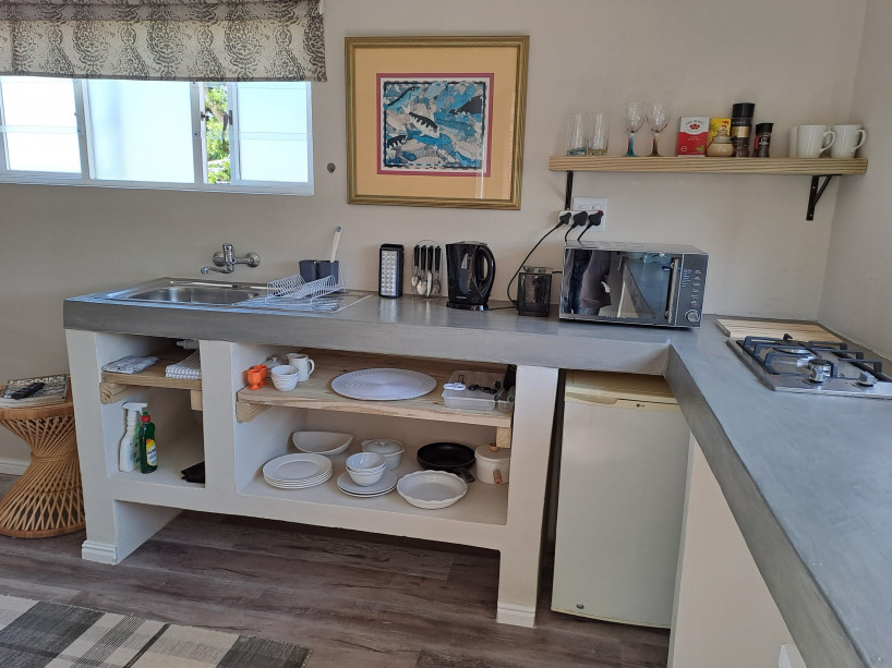 It contains a tea & coffee station, plates, cutlery, bar fridge & microwave.